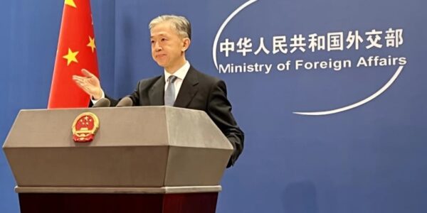 Published by 新華社通信 記者会見に臨む中国外交部の汪文斌報道官。(…