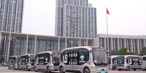 Published by 新華社通信 無錫市の公道を走る小型自動運転バス。(3月…