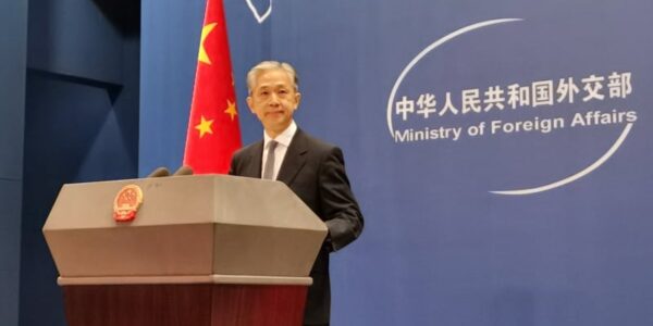 Published by 新華社通信 記者会見に臨む中国外交部の汪文斌報道官。(…