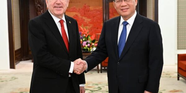 Published by 新華社通信 6日、握手を交わす李強氏(右)とバッハ氏。…