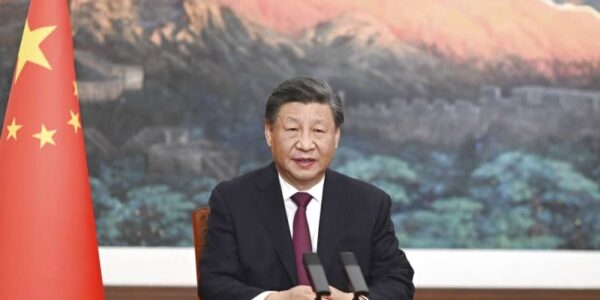 Published by 新華社通信 24日、ビデオ方式であいさつする習近平氏。…