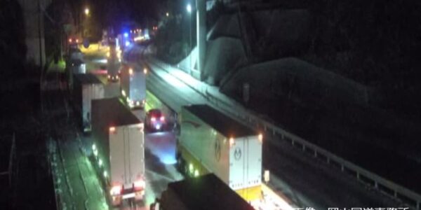 【最強寒波】国道2号 岡山・兵庫県境の立ち往生による通行止めが片側交互通行に 依然、県境を先頭に車列続く【25日午前6時現在】