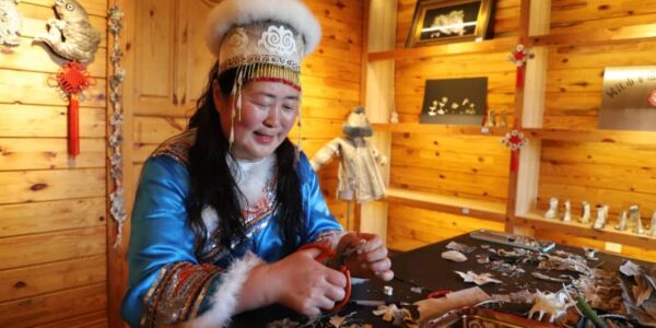 Published by 新華社通信 魚皮工芸品を作るホーチョ族の女性。(5月2…